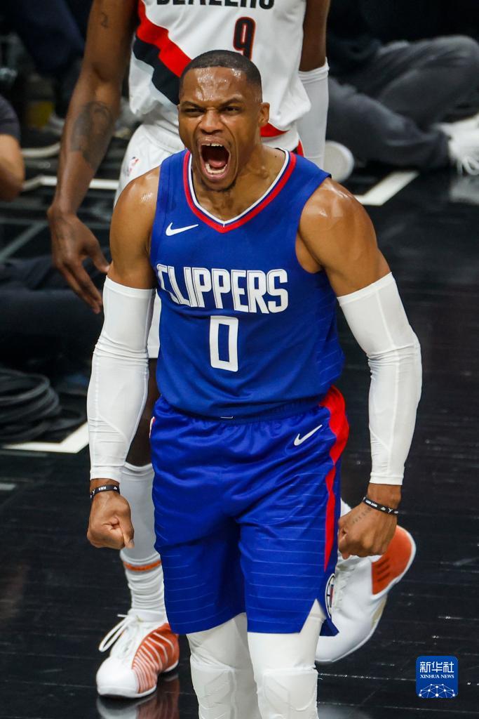 10月25日,快船队球员拉塞尔·威斯布鲁克在比赛中庆祝进球。新华社发(赵汉荣摄)