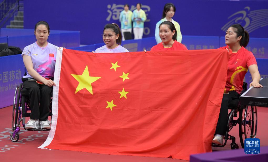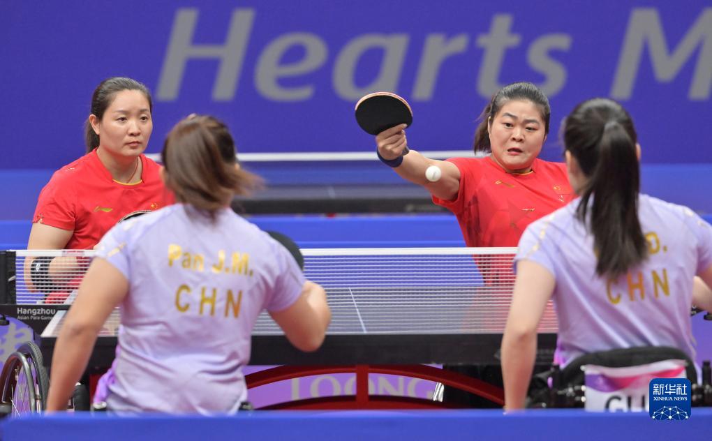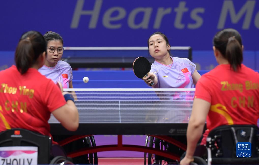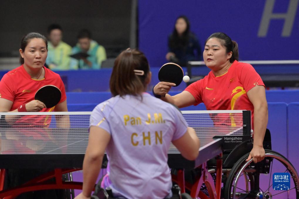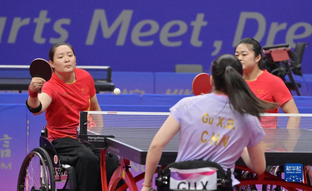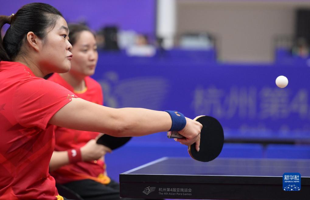 当日,在杭州举行的第4届亚残运会乒乓球女子双打10级决赛中,中国组合张变/周影以3比1战胜队友谷晓丹/潘嘉敏,获得金牌。
