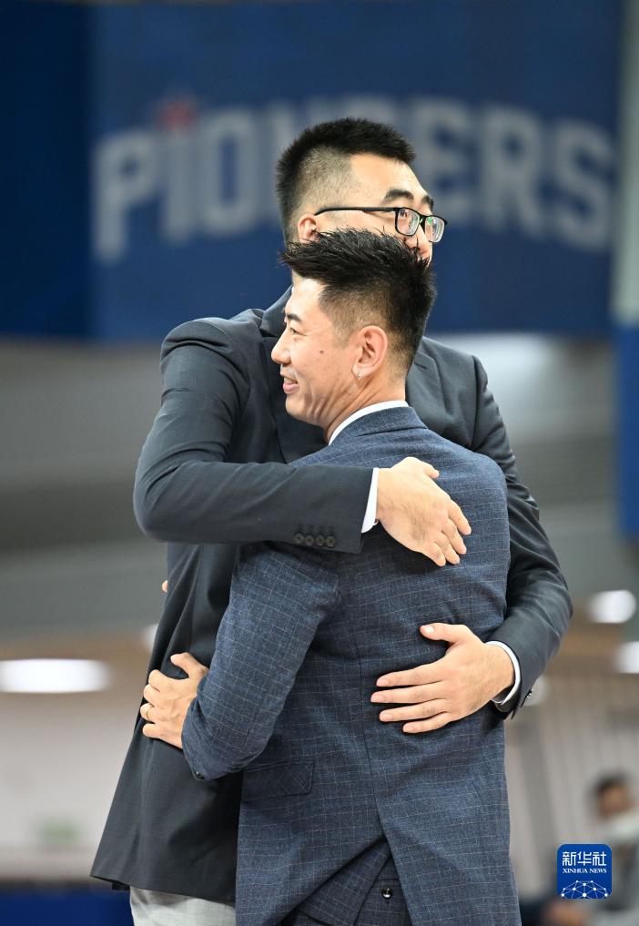 10月27日,张兆旭(后)和张楠在球衣退役仪式上拥抱。新华社记者赵子硕摄