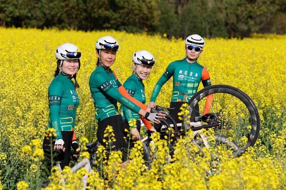 3月26日,2023年黄山自行车赛的参赛队员在黟县油菜花田间合影。