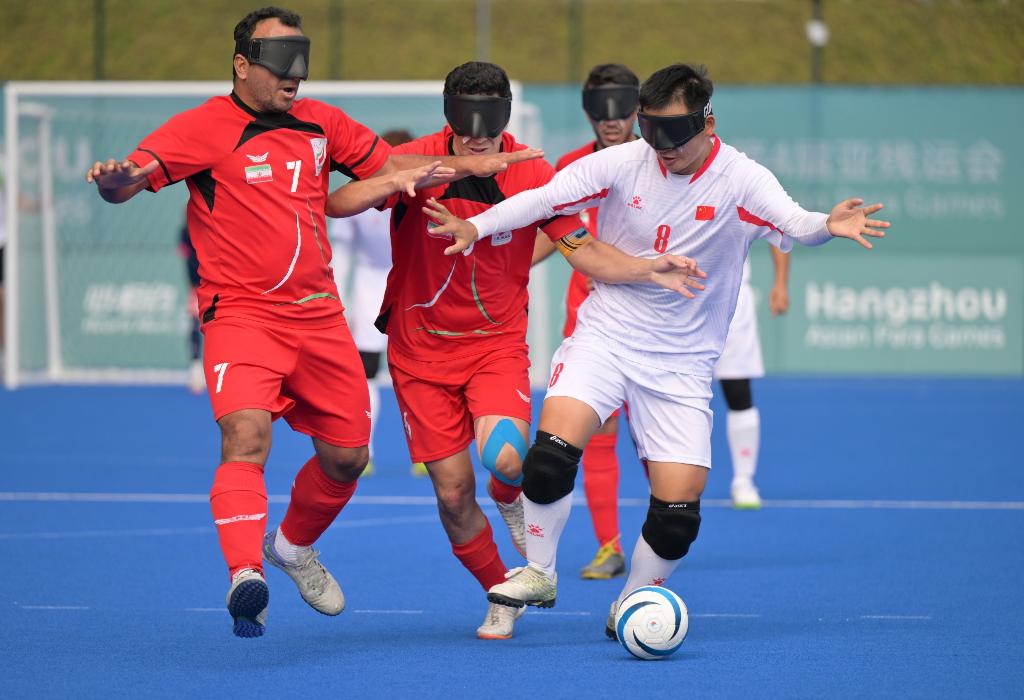10月28日,中国队球员李海福(右一)在盲人足球决赛中拼抢。中国队在点球大战中以2:1战胜伊朗队夺冠。新华社记者才扬摄