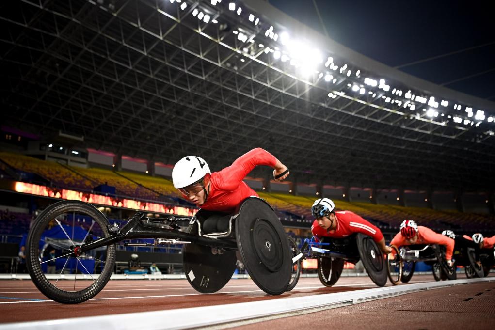 10月23日,杭州第4届亚残运会田径比赛在杭州黄龙体育中心体育场进行,图为中国选手马卓(左一)在男子5000米T54级决赛中。新华社记者江汉摄