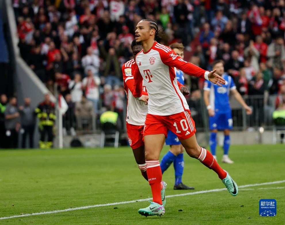 10月28日,拜仁慕尼黑队球员萨内(前)在攻入球队本场比赛第四粒进球后庆祝。
