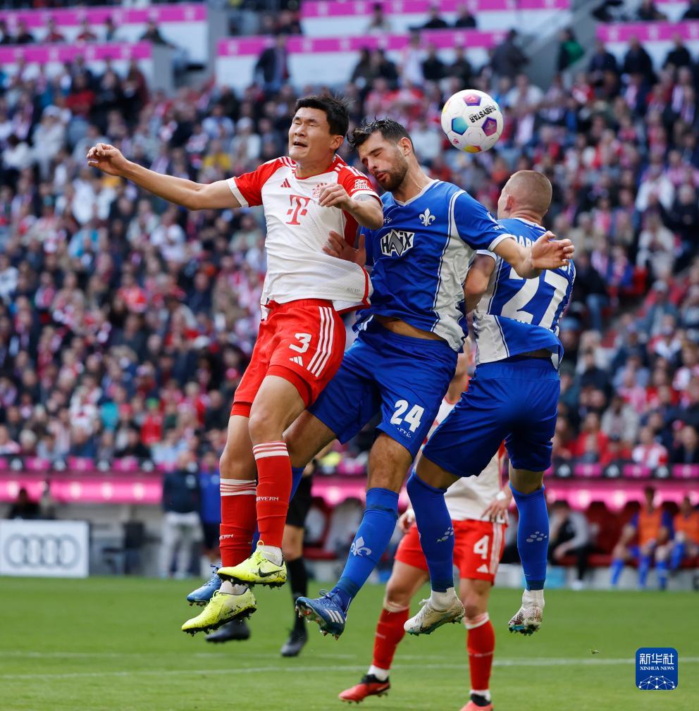 10月28日,,拜仁慕尼黑队球员金玟哉(左)与达姆施塔特队球员普法伊费尔(中)在比赛中争顶。