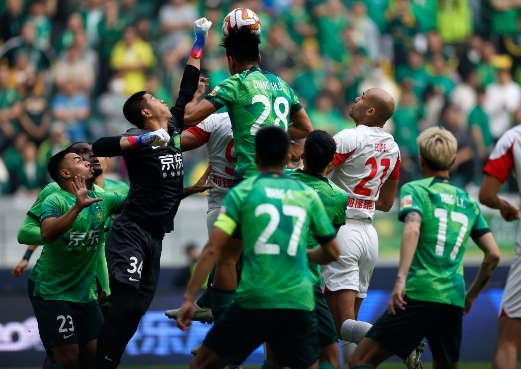 10月29日,北京国安队守门员侯森(左三)在门前解围。新华社记者 王丽莉 摄