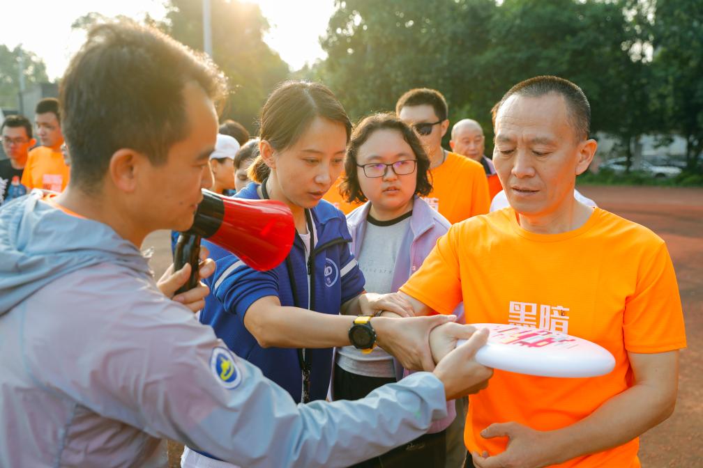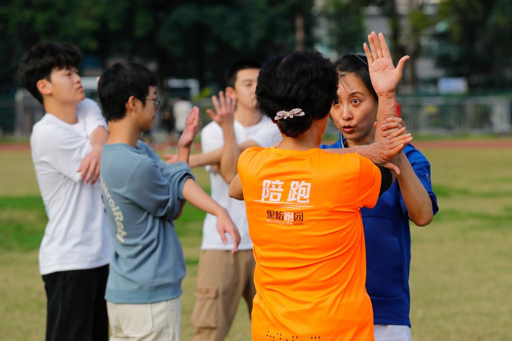 为了更好地理解视障人士,跑团新人志愿者培训的第一课便是戴上眼罩进行“导盲随行”。“以前闭上眼想象自己是盲人和真正去体验盲人行走感觉很不一样,这让我更加理解他们。”成家麟说。