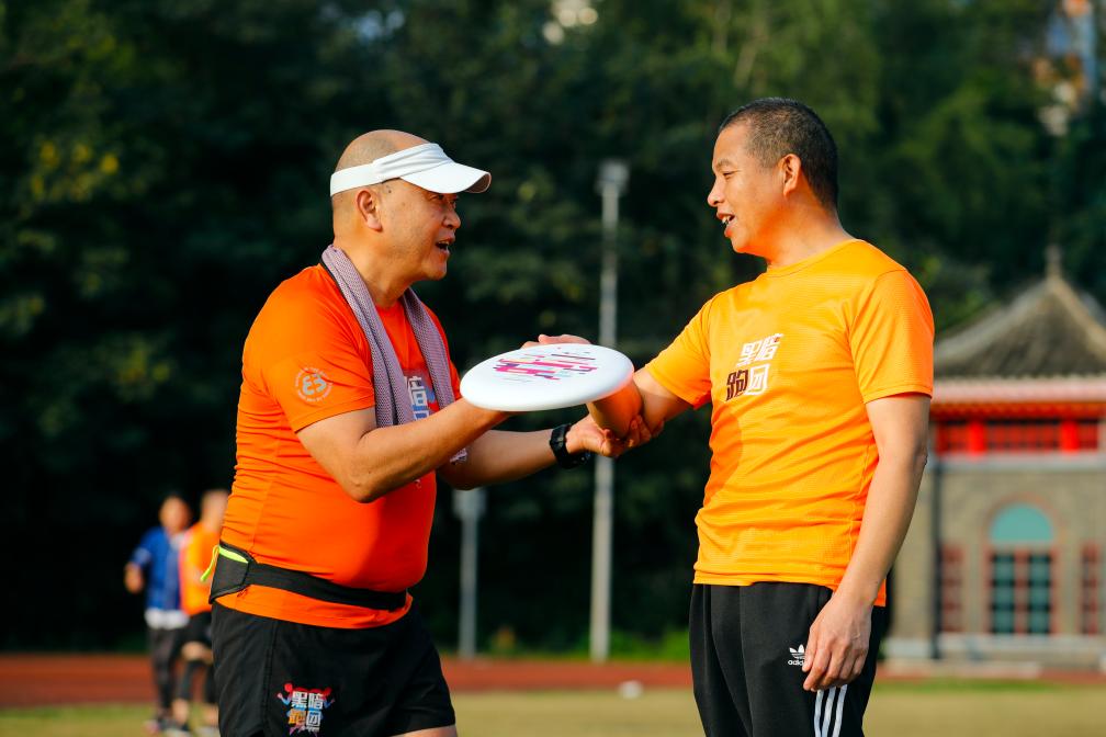 在四川大学华西校区运动场,“黑暗跑团”志愿者谢蜀贤(左)给视障跑者王克泉讲解如何扔飞盘(10月28日摄)。新华社记者 沈伯韩 摄