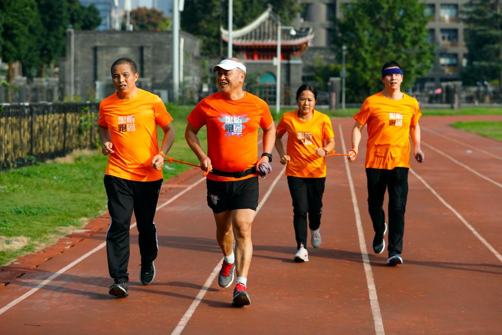 在四川大学华西校区运动场,“黑暗跑团”志愿者谢蜀贤(左二)和许福婵(右二)用陪跑绳带着视障跑者王克泉(左一)、吴小华训练(10月28日摄)。新华社记者 沈伯韩 摄