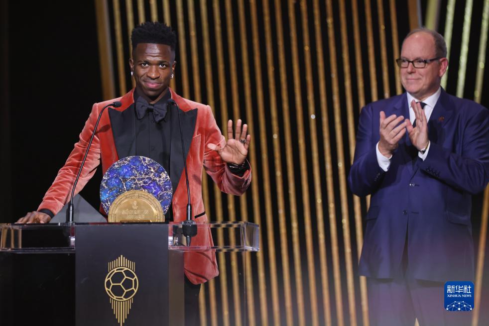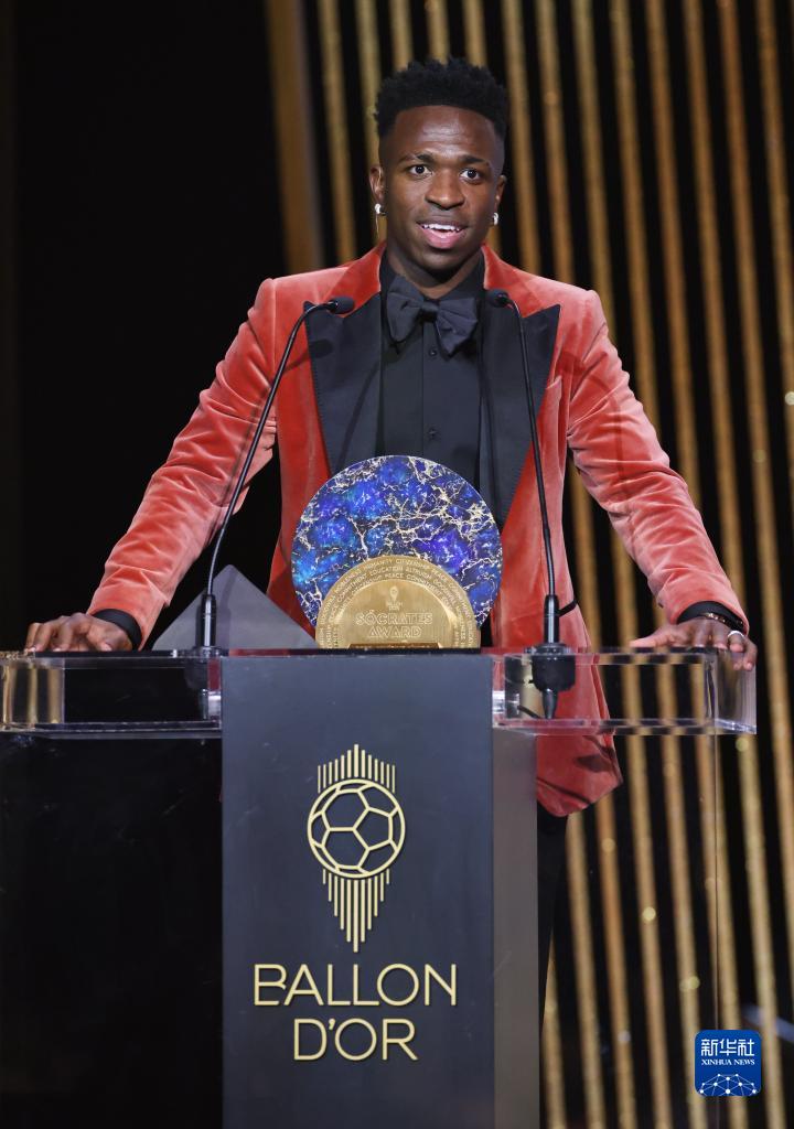 10月30日,巴西球员维尼修斯因创建帮助弱势儿童的基金会而获得苏格拉底奖。新华社记者 高静 摄