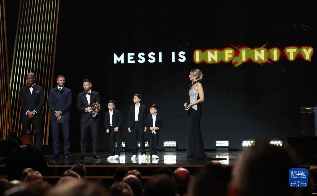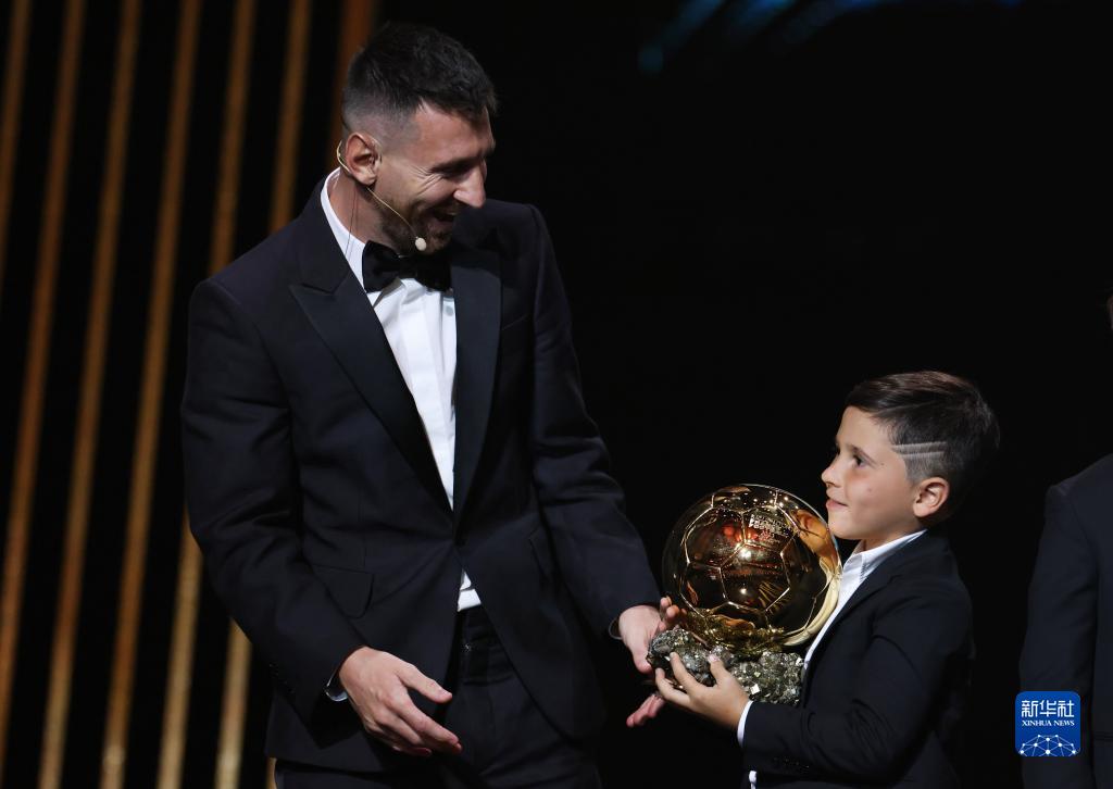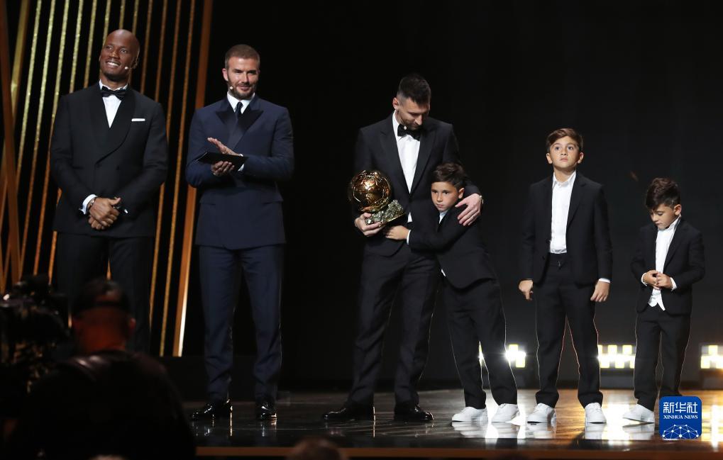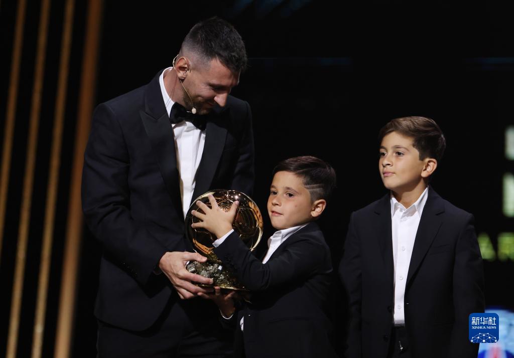 10月30日,梅西(左)与自己的孩子一同出席颁奖典礼。新华社记者 高静 摄