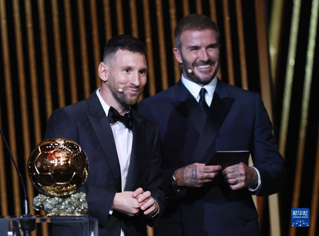 10月30日,梅西(左)与颁奖嘉宾贝克汉姆在颁奖典礼上。新华社记者 高静 摄