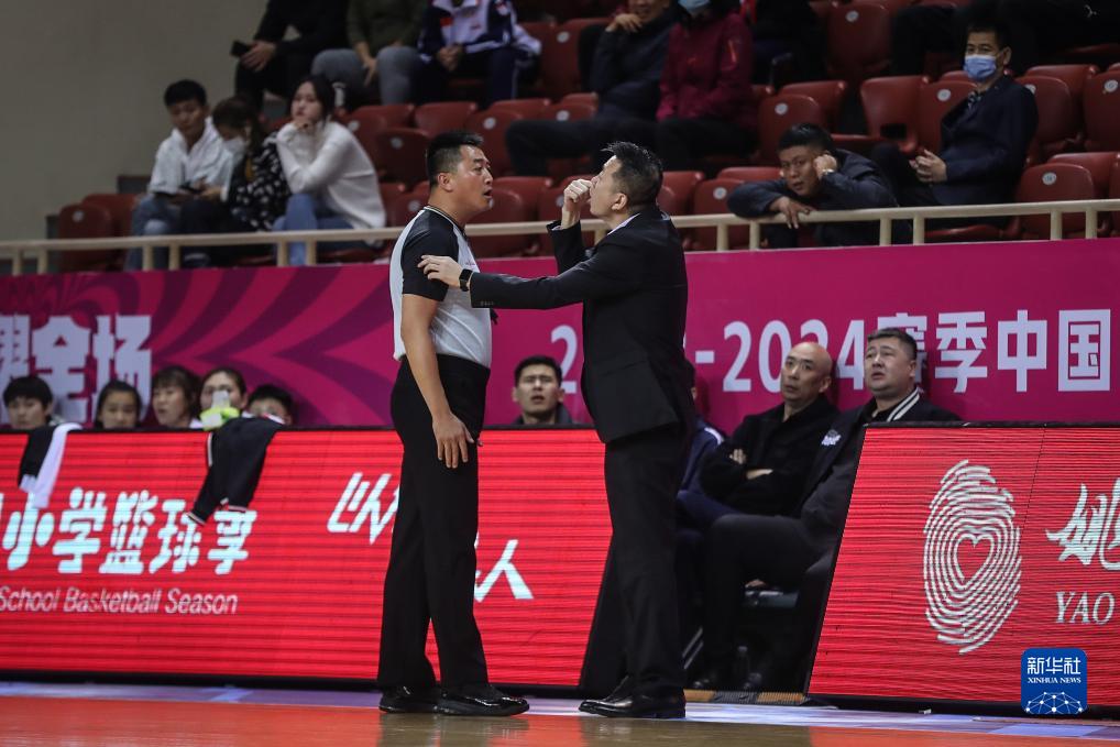 11月1日,新疆天山队主教练贾楠(右)在比赛中与裁判沟通。新华社记者 潘昱龙 摄