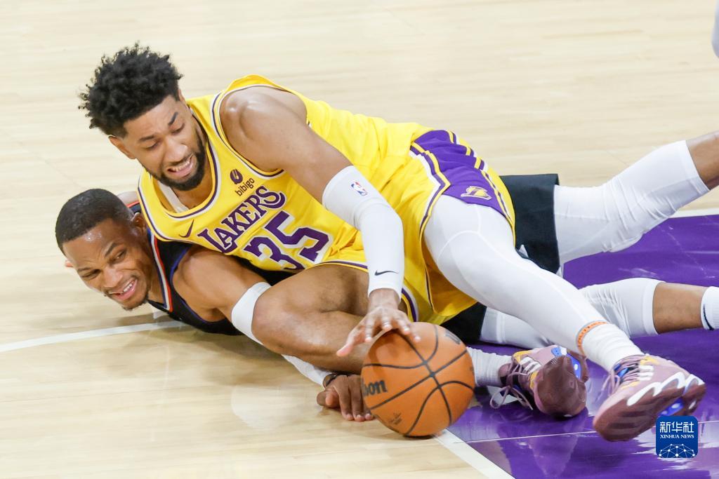 11月1日,湖人队球员克里斯蒂安·伍德 (上) 与快船队球员拉塞尔·威斯布鲁克在比赛中拼抢。新华社发(赵汉荣摄)