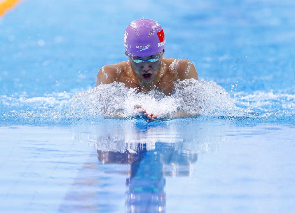 11月1日,南京市选手董志豪在比赛中,他获得男子100米蛙泳公开组冠军。当日,第一届全国学生(青年)运动会游泳项目比赛在广西南宁开赛。新华社记者 胡星宇 摄