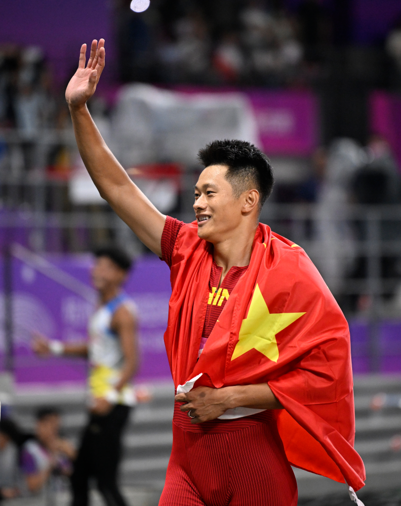 谢震业在杭州亚运会田径项目男子100米决赛赛后庆祝
