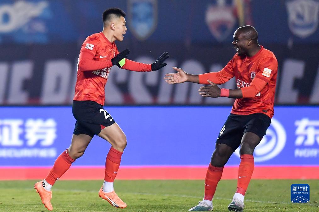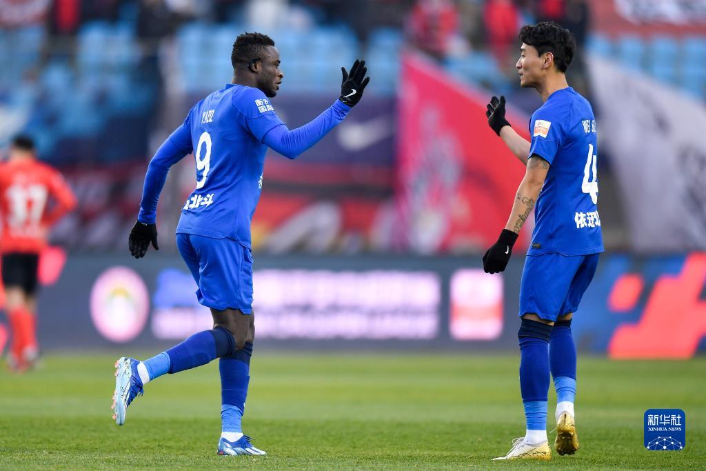 11月4日,武汉三镇队球员阿齐兹(左)与韦世豪在比赛中庆祝进球。新华社记者 许畅 摄