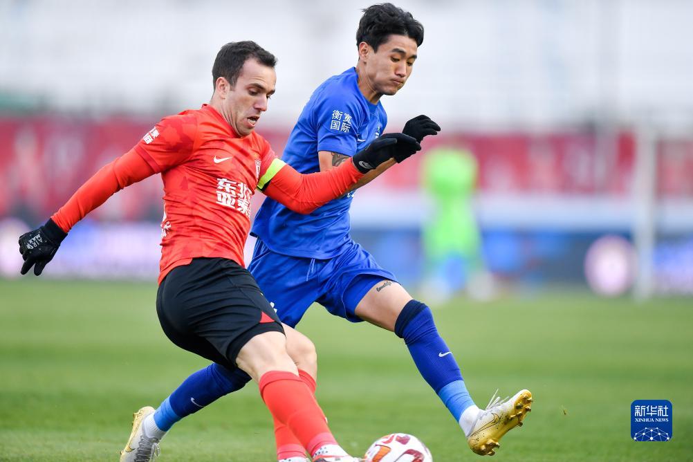 11月4日,长春亚泰队球员塞尔吉尼奥(左)在比赛中与武汉三镇队球员韦世豪拼抢。新华社记者 许畅 摄