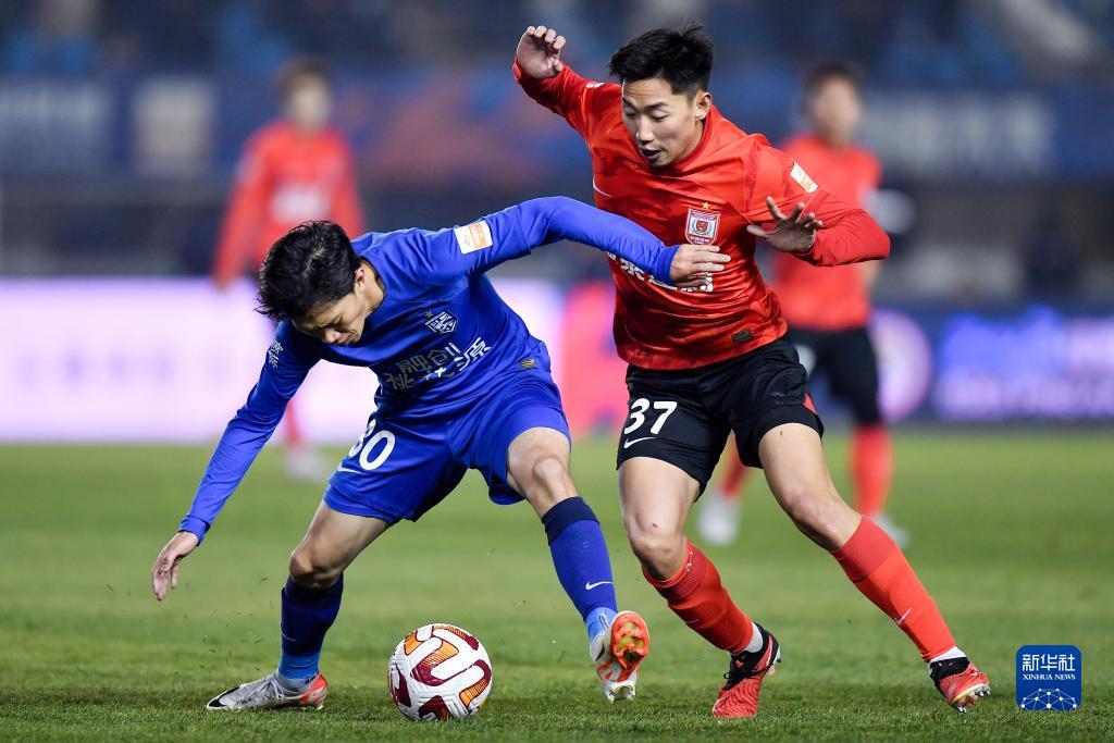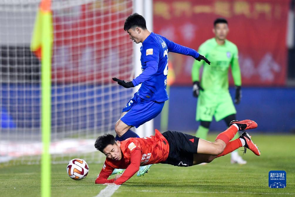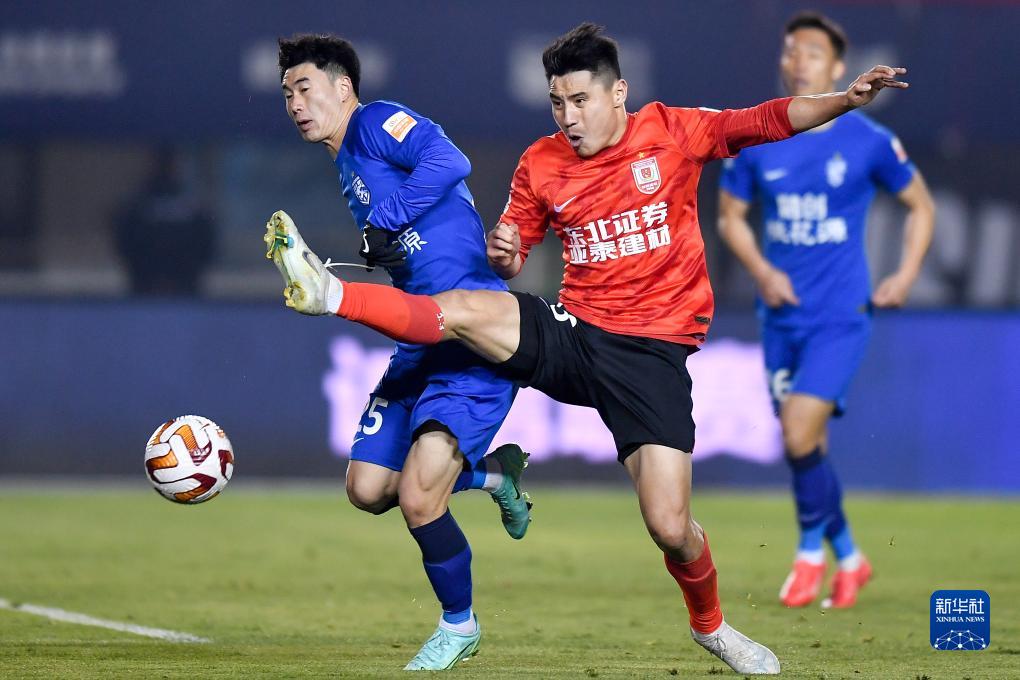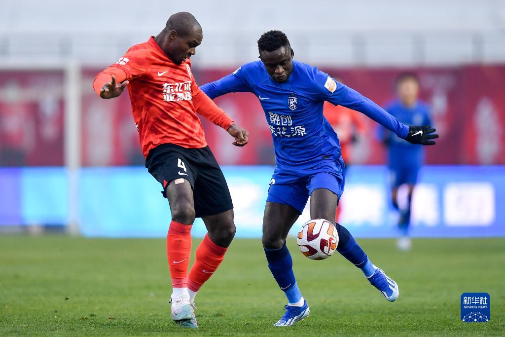11月4日,长春亚泰队球员程长城(右)在比赛中与武汉三镇队球员邓涵文拼抢。新华社记者 许畅 摄