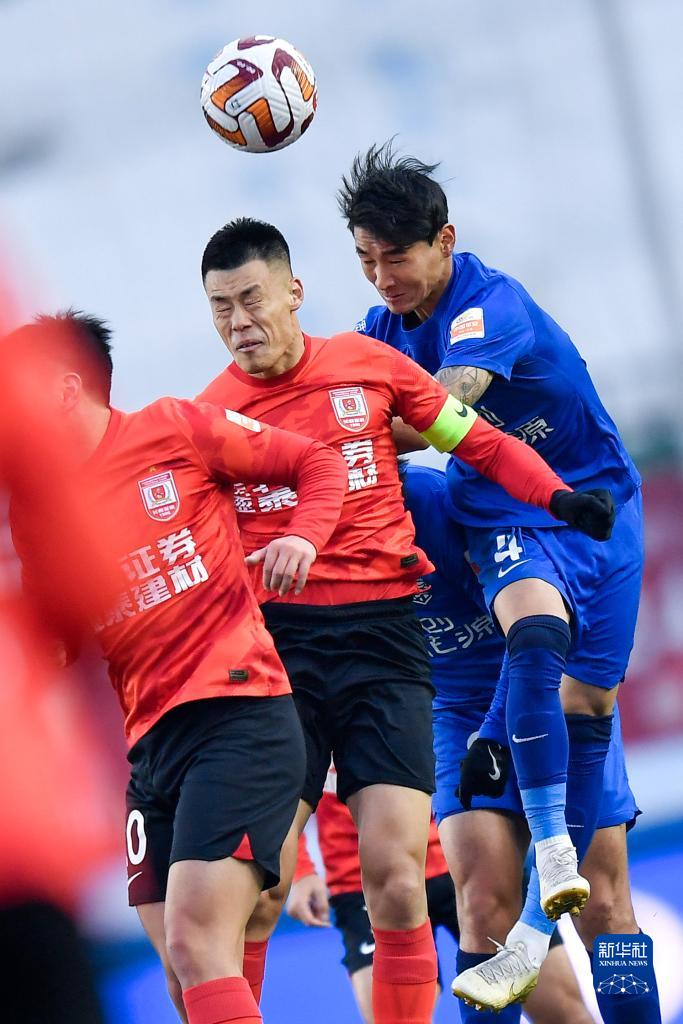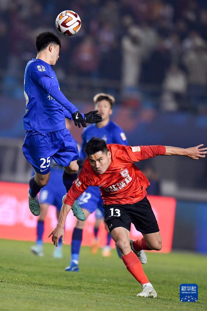 11月4日,长春亚泰队球员程长城(右)在比赛中与武汉三镇队球员邓涵文争顶头球。新华社记者 许畅 摄
