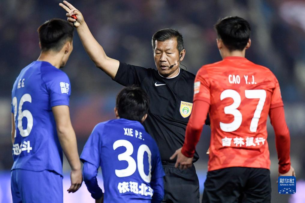 11月4日,主裁判王哲在比赛中判罚。新华社记者 许畅 摄