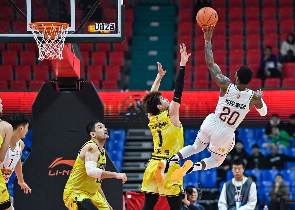11月4日,北京控股队球员费尔德(右一)在比赛中投篮。新华社记者 颜麟蕴 摄