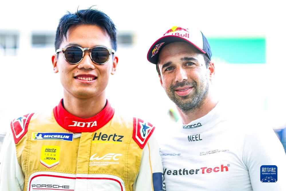 11月4日,Hertz Team Jota车队中国车手叶一飞(左)与Proton Competition车队的瑞士车手尼尔·贾尼合影。新华社发(钱俊摄)