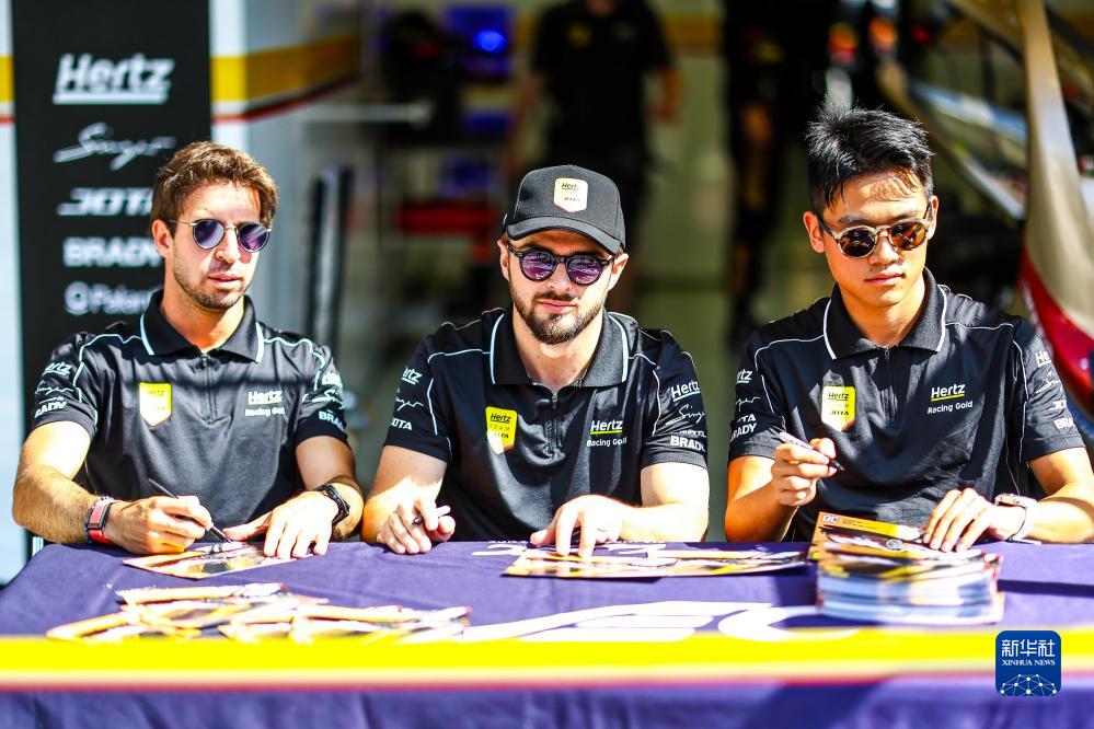 11月4日,Hertz Team Jota车队中国车手叶一飞(右)在赛前签名仪式上。新华社发(钱俊摄)