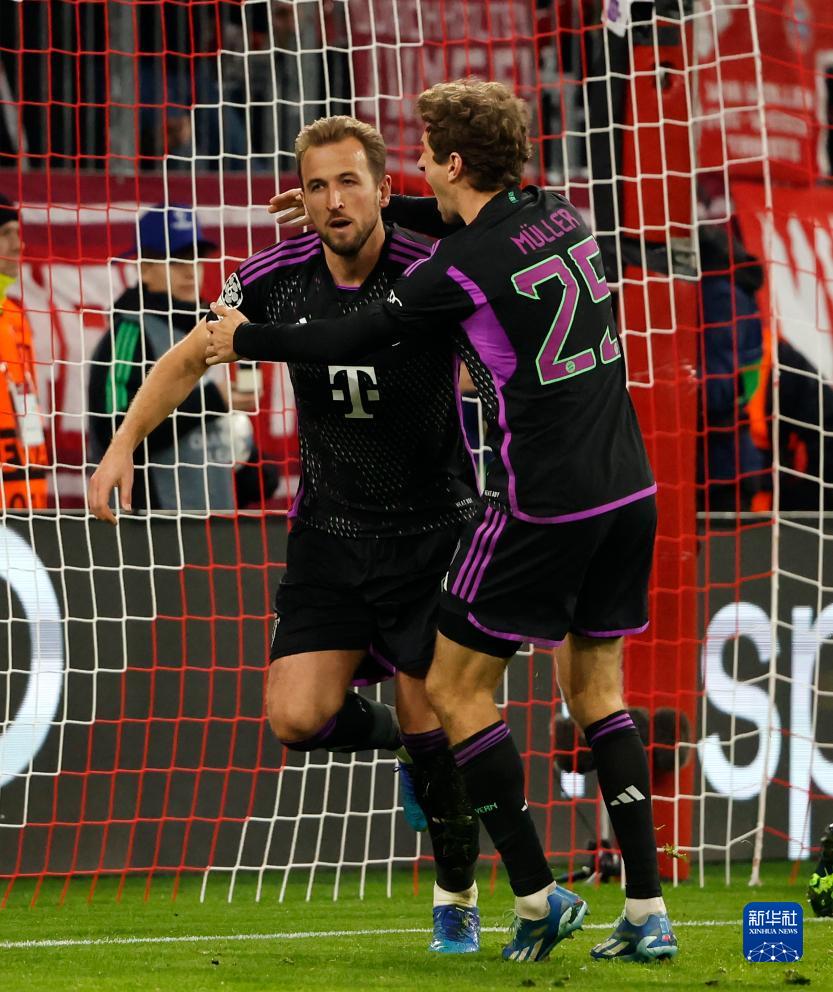11月8日,拜仁慕尼黑队球员凯恩(左)在进球后与队友穆勒庆祝。新华社发(菲利普·鲁伊兹摄)