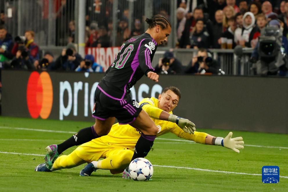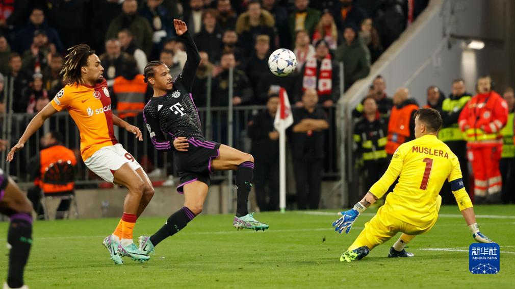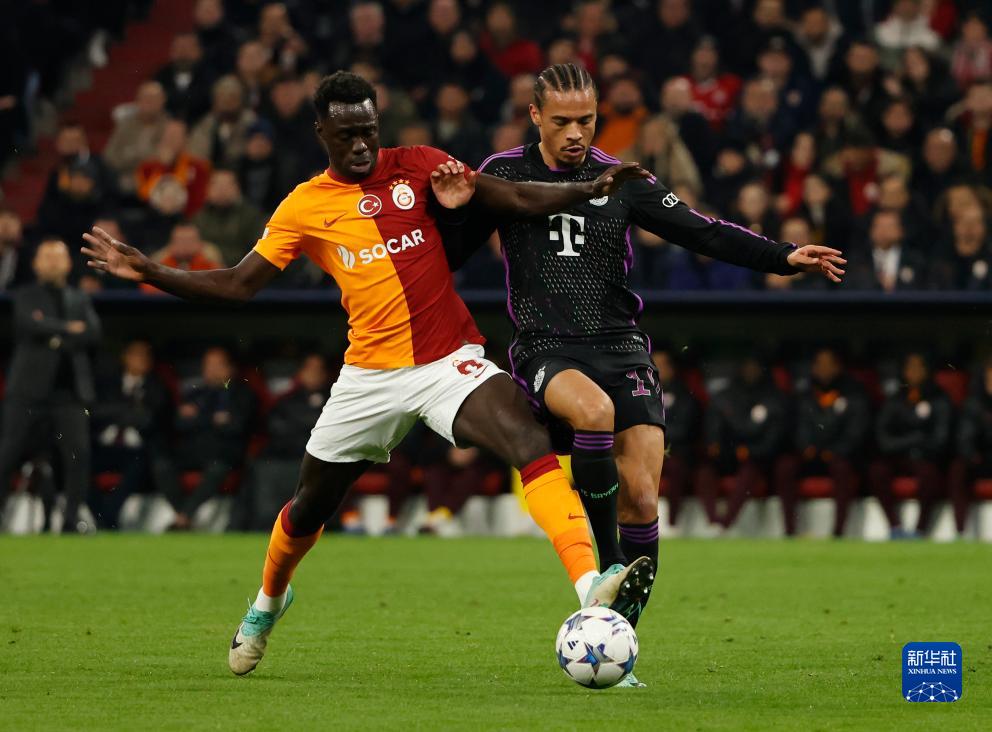 11月8日,拜仁慕尼黑队球员萨内(上)和加拉塔萨雷队守门员穆斯莱拉在比赛中拼抢。新华社发(菲利普·鲁伊兹摄)