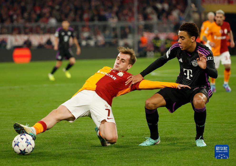 11月8日,拜仁慕尼黑队球员穆夏拉(右)与加拉塔萨雷队球员阿克图科格鲁在比赛中拼抢。新华社发(菲利普·鲁伊兹摄)