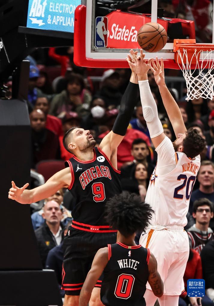 11月8日,公牛队球员武切维奇(左)与太阳队球员努尔基奇在比赛中争抢篮板球。新华社发(乔尔·莱纳摄)