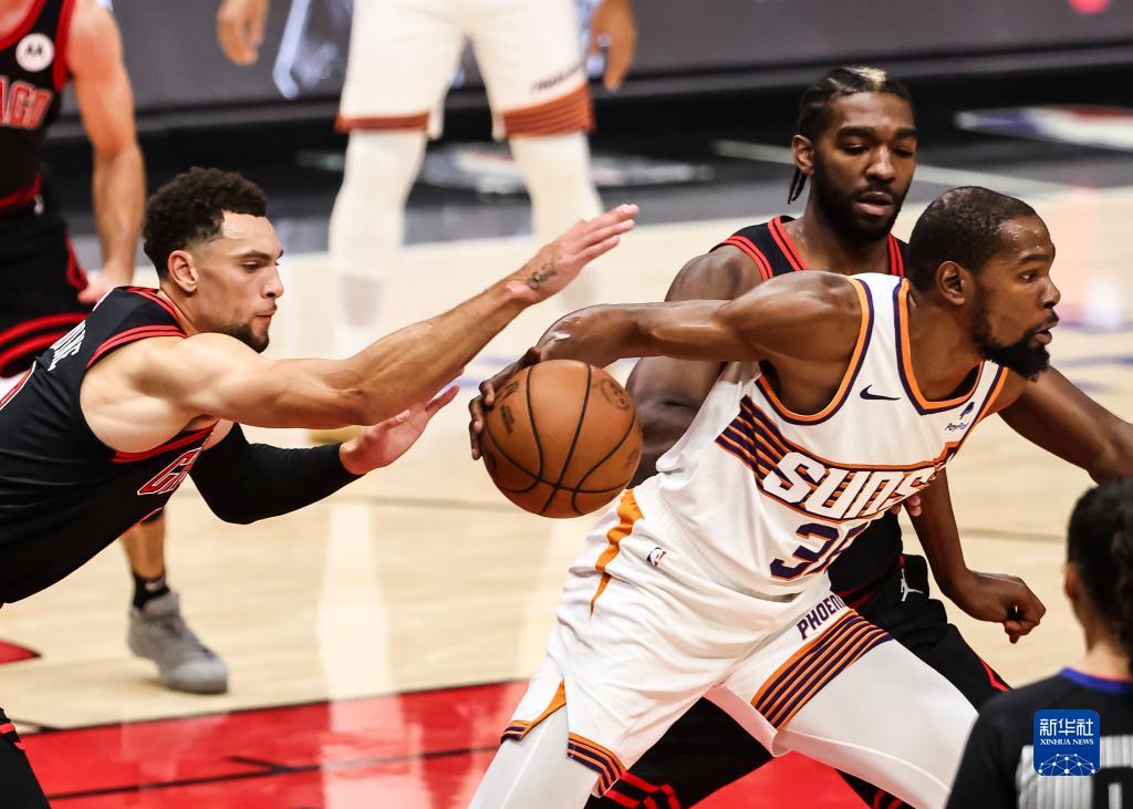 11月8日,公牛队球员拉文(左)在比赛中从太阳队球员杜兰特手中偷球。新华社发(乔尔·莱纳摄)
