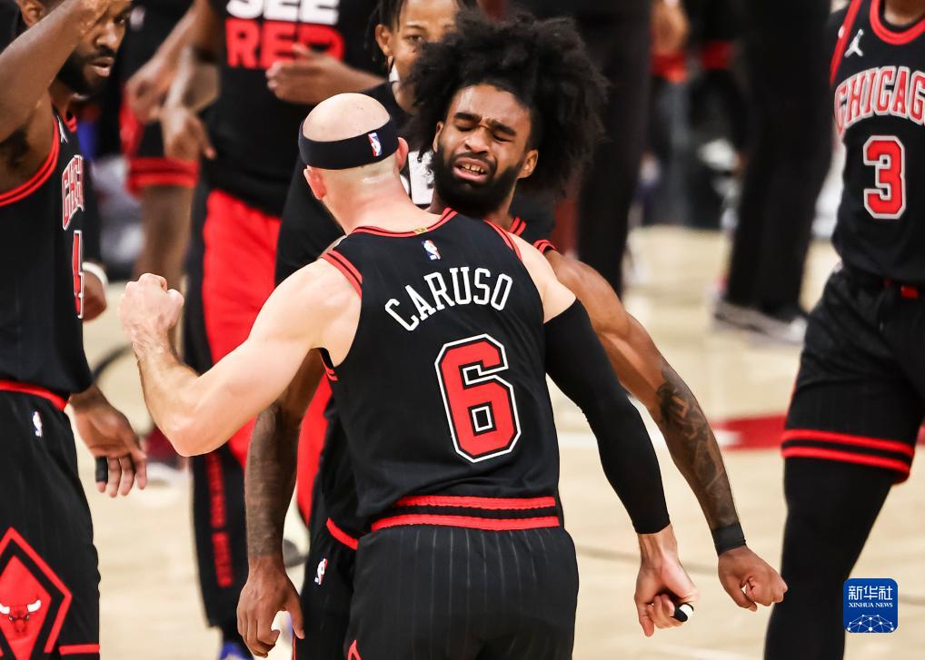 11月8日,公牛队球员卡鲁索(前)与队友怀特在比赛中庆祝得分。新华社发(乔尔·莱纳摄)