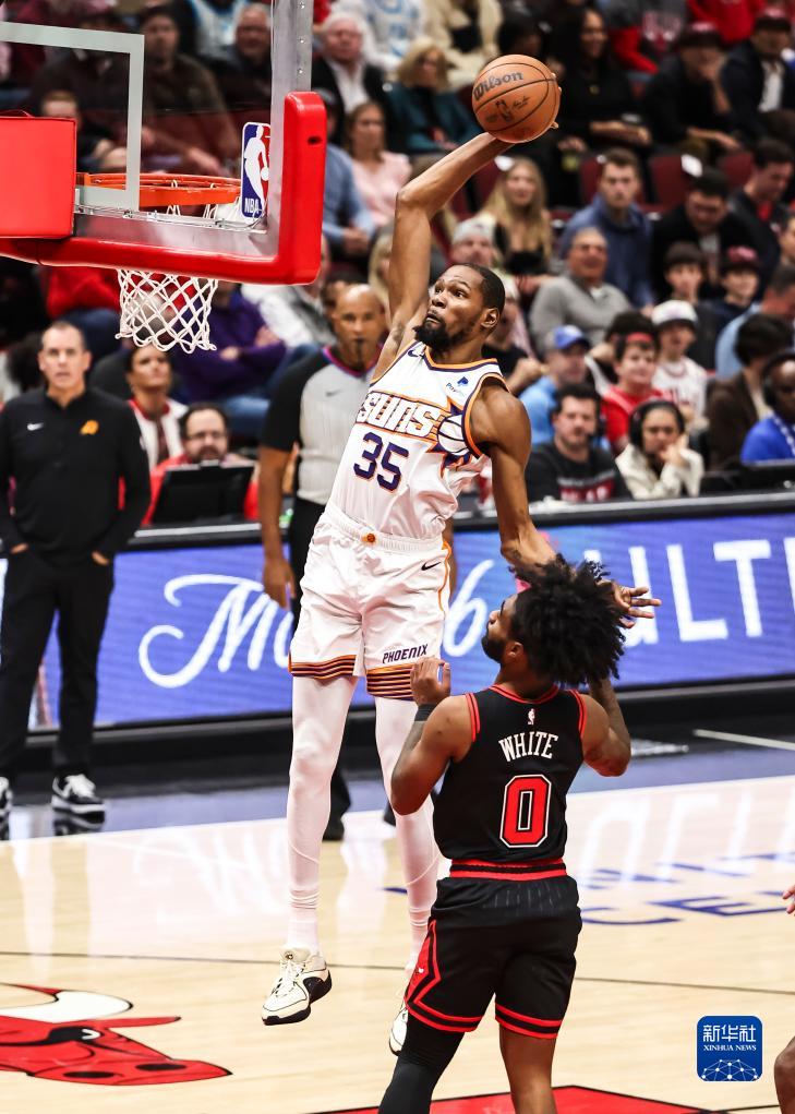 11月8日,太阳队球员杜兰特在比赛中扣篮。新华社发(乔尔·莱纳摄)