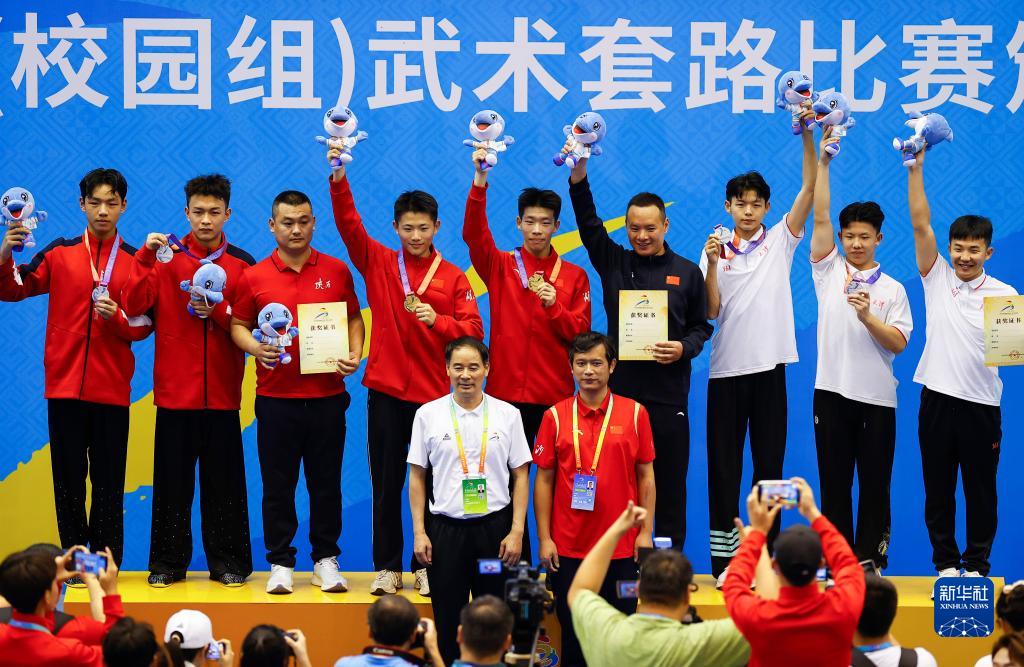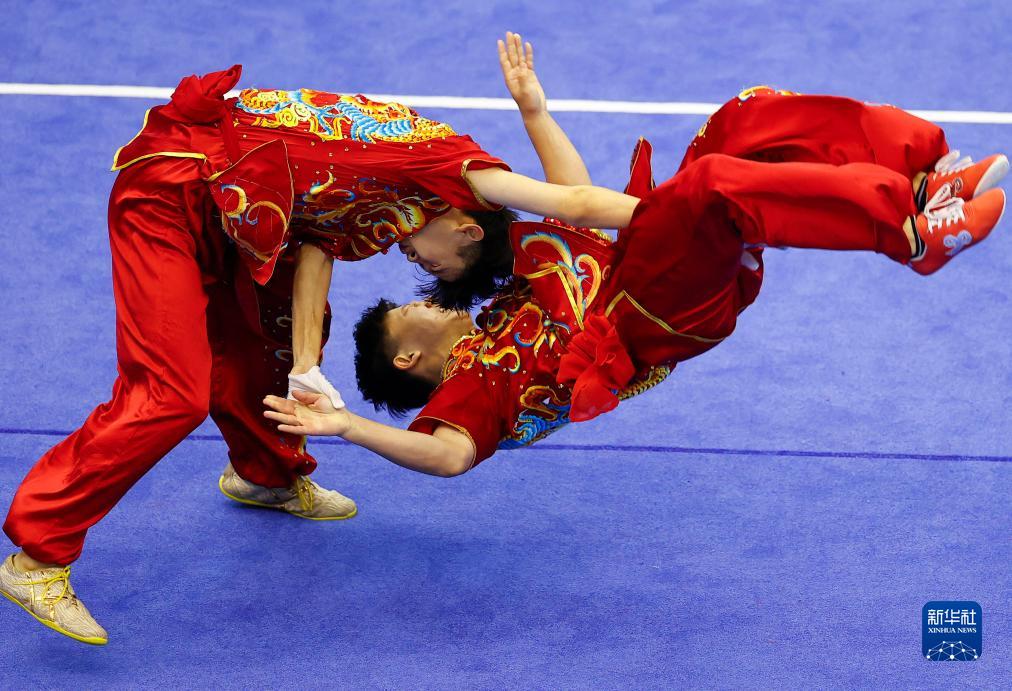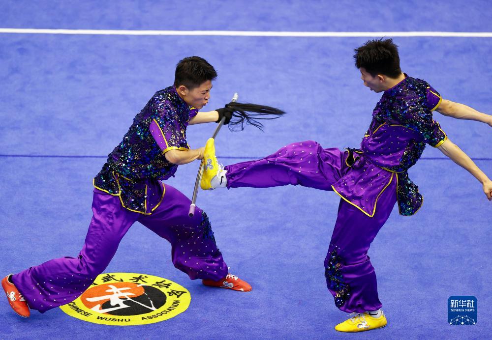 当日,第一届全国学生(青年)运动会武术套路中学组男子对练决赛在广西壮族自治区体育馆举行。