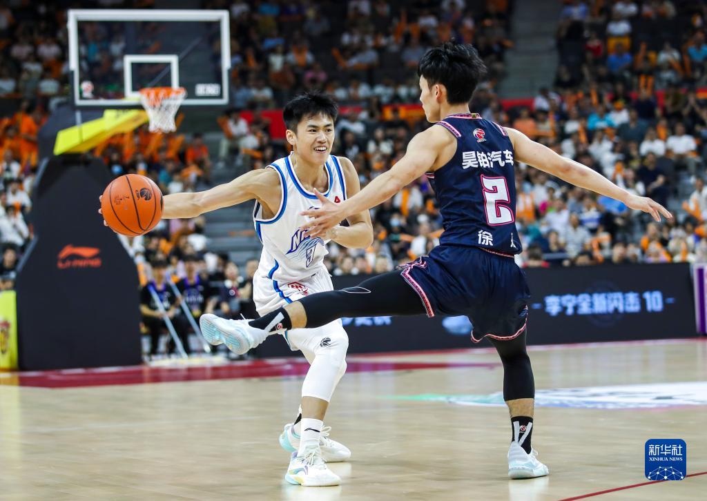 11月10日,广东华南虎队球员张文逸(左)突破分球。新华社发(郑家雄摄)