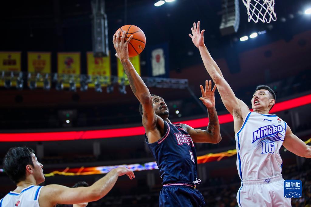 11月10日,宁波町渥队球员阿尔斯兰(左三)上篮受阻。新华社发(郑家雄摄)