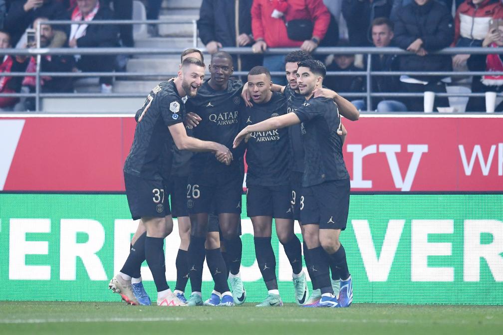 姆巴佩(右三)与队友庆祝进球。图片来自法甲联赛官方社交媒体