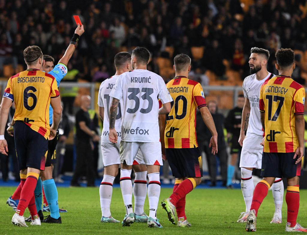 11月11日,主裁判向AC米兰队球员吉鲁(右二)出示红牌。新华社发(阿尔贝托·林格里亚摄)