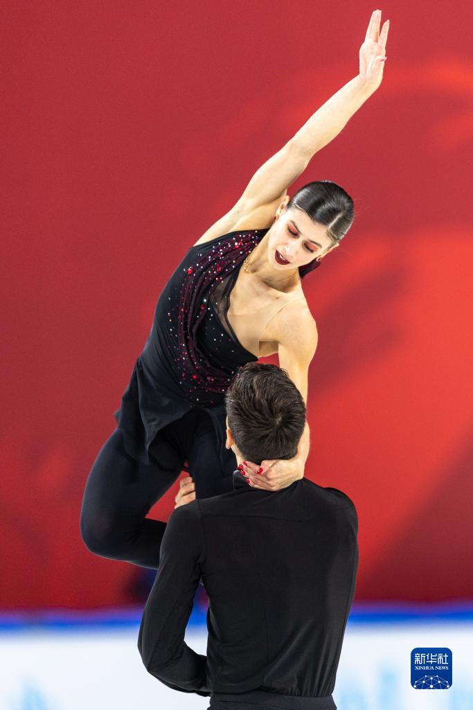 11月11日,意大利组合吉拉尔迪(左)/安布罗西尼在双人滑自由滑比赛中。最终,他们以191.00分的总成绩获得双人滑亚军。新华社记者 黄伟 摄