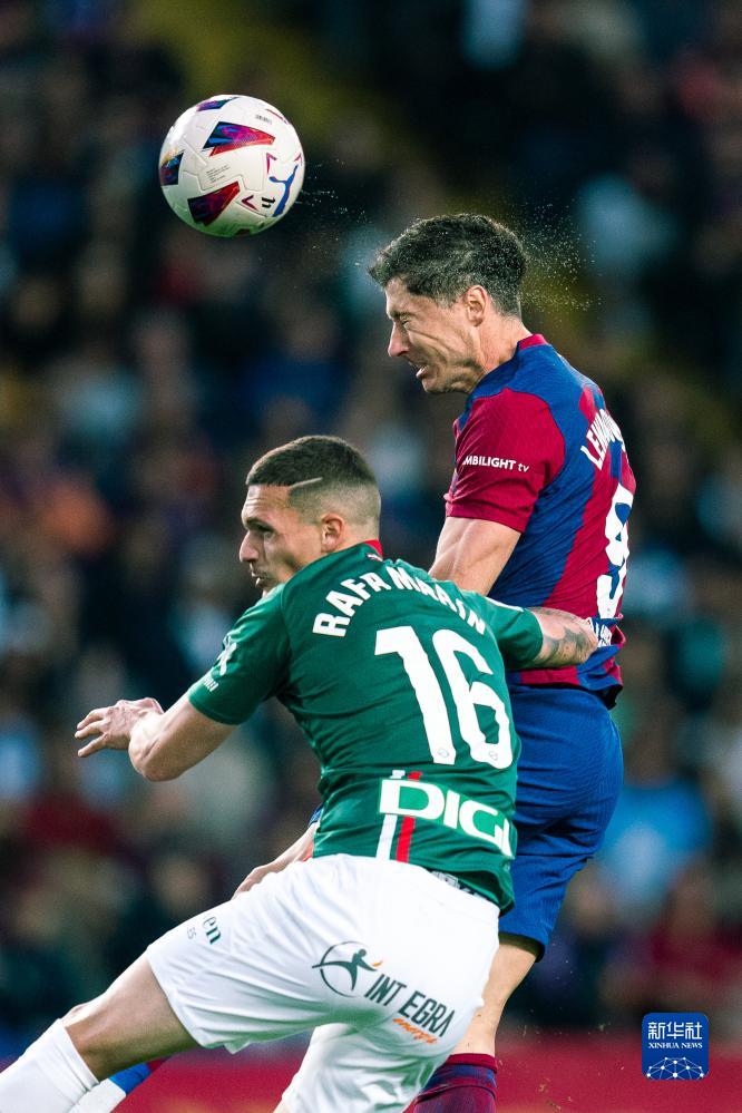 11月12日,巴塞罗那队球员莱万多夫斯基(上)在比赛中头球破门得分。新华社发(胡安·戈萨摄)