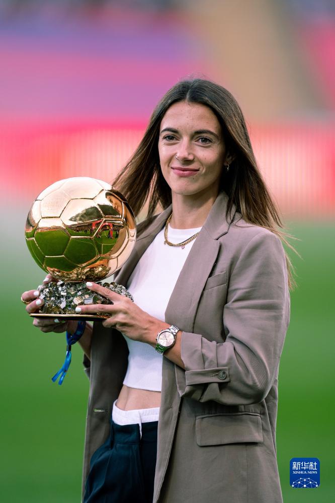 11月12日,巴塞罗那队女足球员邦马蒂在比赛前展示她获得的女子金球奖奖杯。新华社发(胡安·戈萨摄)