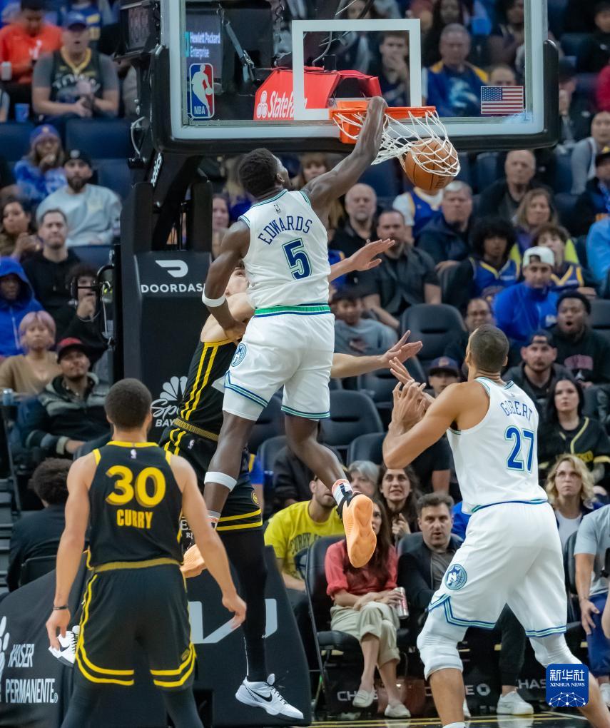 11月12日,森林狼队球员安东尼·爱德华兹(上)在比赛中扣篮。新华社发(董旭东摄)