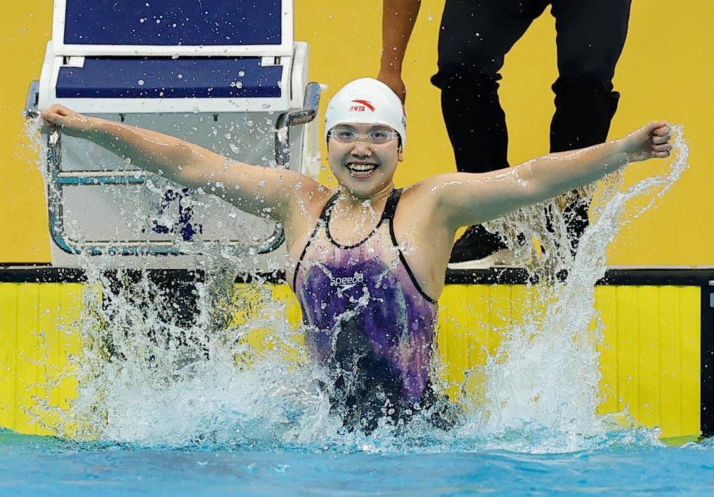 11月7日,山东选手李香凝在获胜后庆祝,她以1分00秒18的成绩获得第一届全国学生(青年)运动会中学组女子100米蝶泳决赛冠军。新华社记者 杨植森 摄