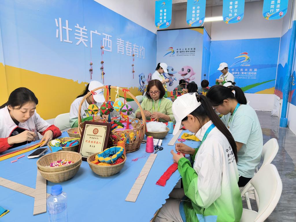 本届学青会运动员村的非遗文化体验区成为不少运动员的“打卡点”,非遗项目传承人和志愿者现场教学,运动员在比赛、训练间隙,前来参与剪纸、邕剧脸谱绘画、“点米成画”、布艺绣球、编香包等手工项目。