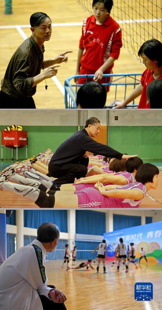 这是一张拼版照片,上图为2003年10月16日拍摄的郝振生(左)指导队员训练(新华社记者廖宇杰摄);中图为2012年5月6日拍摄的郝振生指导队员进行体能训练(新华社记者赵婷婷摄);下图为2023年11月9日拍摄的郝振生观看队员赛前训练(新华社记者侯昭康摄)。新华社发