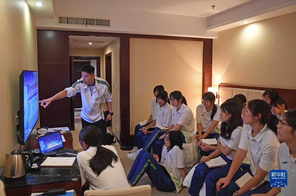 11月9日,教练蔡茂鑫(上左)在准备会上为队员讲解录像。新华社记者 侯昭康 摄