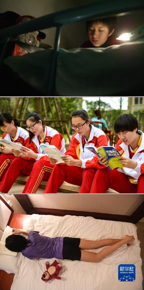 这是一张拼版照片,上图为2003年10月18日拍摄的包头一中女排队员结束晚间训练后“挑灯夜读”(新华社记者廖宇杰摄);中图为2015年10月22日拍摄的包头一中女排队员吴岩(右二)和队友们在第一届全国青运会青运村里背单词(新华社记者毛思倩摄);下图为2023年11月9日拍摄的包头一中女排队员王睿敏晚上在酒店房间学习(新华社记者侯昭康摄)。新华社发