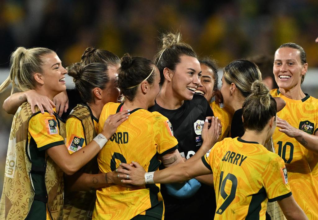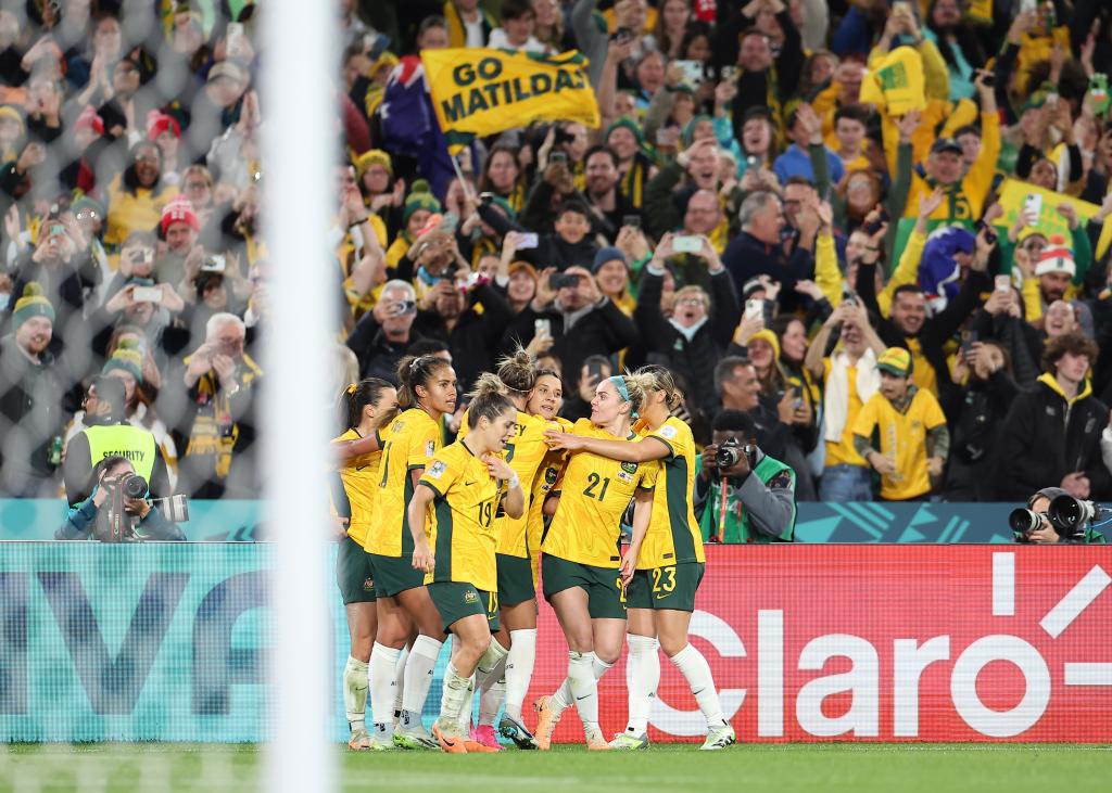 8月12日,澳大利亚队球员在获胜后庆祝。当日,澳大利亚队战胜法国队,晋级2023年国际足联女足世界杯四强。新华社记者 李一博 摄