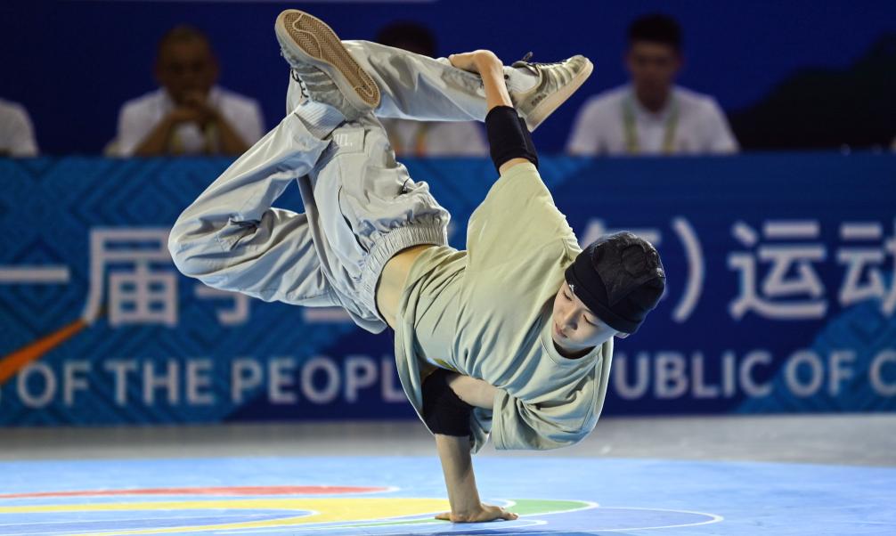 11月4日,第一届全国学生(青年)运动会霹雳舞比赛在广西钦州市体育中心体育馆举行。新华社记者 张爱林 摄